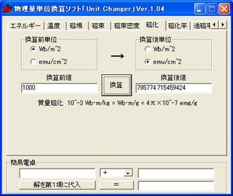物理量単位換算ソフト「Unit Changer」では、単位の種類ごとにタブでページを切り替え、変換の計算を行います。各ページは左右に分かれており、左側で変換前の単位を、右側で変換後の単位を指定します。入力欄に変換したい数値を入力し、「換算」ボタンを押すと結果が表示されます。操作は以上で完了なので、数秒ほどしかかかりません。